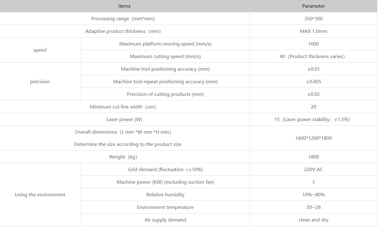 Suitable for FPC auxiliary covering film (CVL), flexible board (FPC), soft and hard combined board (RF) and thin multilayer board cutting forming, under the screen fingerprint module, as well as window and uncovering, camera module and PCB board cutting.